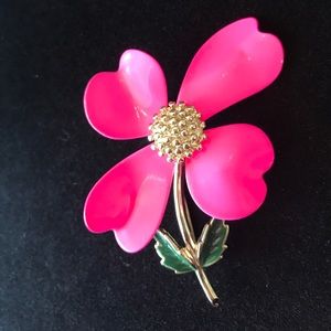 Fun and funky Vintage flower brooch signed Sarah Coventry. Painted metal flower and leaves. 2 & 3/4" tall and just over 2" wide. In excellent condition, with only one small mark on one petal - see photo for mark.