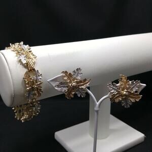 *Description: This is a beautiful Sarah Coventry "Garland" earrings and bracelet set in gold and silver tone from 1968. This book piece is shown in "Sarah Coventry Jewelry" by Kay Oshel. These pieces are silver and gold tone leaves on clip earrings and a link bracelet. This would be a great addition to your vintage jewelry collection or make a great vintage gift!