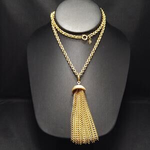 *Description: This is a vintage gold tone Sarah Coventry tassel necklace from the 1970s. Sarah Coventry made a lot of their jewelry with a spring ring pendant so you could wear the chain by itself or with the detachable pendant. This tassel has a large spring ring and 24 chains which hang below a beehive shape. The chain also has a smaller spring ring clasp. This necklace hangs beautifully and at the same time is very light in weight. It would make a great gift or a wonderful addition to your vintage jewelry collection.