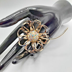 Description: This vintage Sarah Coventry brooch pin from 1968 features a cluster of flower-shaped rhinestones in gold, clear, and Aurora Borealis colors. The main stone is a white/colorless rhinestone set in a gold tone metal setting. It is signed by Sarah Coventry and measures 3.5" in length. This brooch is part of the Allusion Series and is a charming piece perfect for occasions like Mother's Day, graduation, anniversary, birthday, or Valentine's Day. Made in the United States during the midcentury modern era, it exudes a classic and elegant aesthetic. This would be a great addition to your jewelry collection or make a great gift!