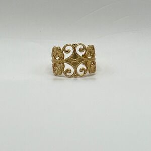 Beautiful vintage Sarah Coventry filigree ring in a gold-tone finish. The openwork scroll design creates a wide band look while still being lightweight and comfortable. Adjustable open back allows for flexibility in sizing.