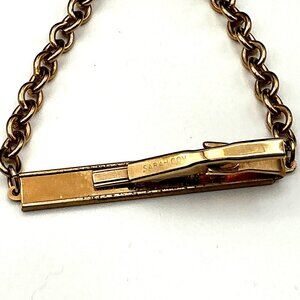 This elegant gold-tone tie bar with an attached chain by Sarah Coventry offers a refined touch to formal attire, ensuring both style and function.