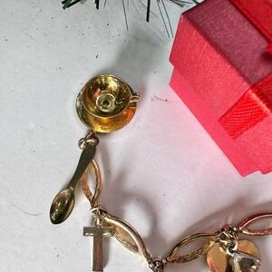 This is the Sarah Coventry bell charm bracelet, but additional charms have been added, including an adorable coffee cup and spoon, a cross, two hearts, a boot, a teapot, a star, and a cruise ship.