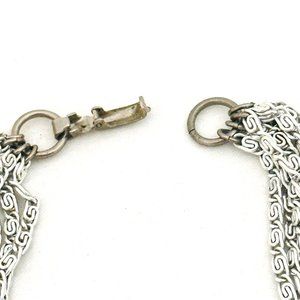 Very lightweight Sarah Coventry necklace. It is eight strands of an S-Chain made of silvertone aluminum. Incredibly lightweight. Silver color is great on all the chains. The foldover clasp and rings are a bit darker and probably a different metal. Beautiful silvery cascade. Length is approx. 15.25 inches. Signed Sarah Cov.