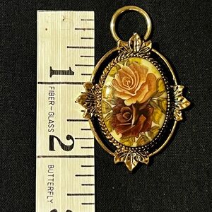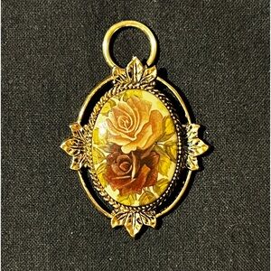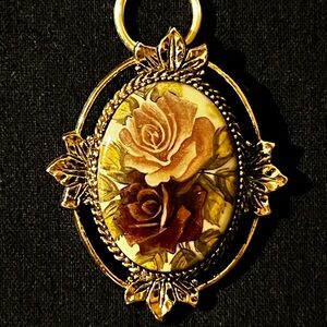 "Roses" pendant, from the 70's, I believe. Lovely display of two roses in shades of pink/wine. Set in a gold tone frame with leaf motif. Photos seem to show it more yellowy than in person; they also show details and size. Pendant only, no chain or chord. Marked Coventry on back. Nice vintage piece.