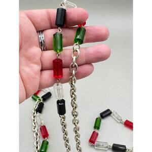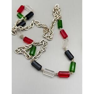 Vintage Sarah Coventry Retro necklace and bracelet set featuring red, white, black, and green lucite cylinder shaped beads with a lightweight brushed silver tone chain. Sarah Coventry signed. Necklace measures 36" long and bracelet 8".
