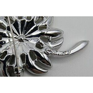 This mid-century Sarah Coventry brooch showcases a radiant floral design. The silver-tone metal contrasts beautifully with yellow and green rhinestones, adding bold elegance to any vintage-inspired collection.