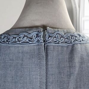 Vintage 90's. Short sleeve v-neck sheath dress features decorative front buttons, embroidery along neckline, sleeves, front and hem, woven fabric, fully lined with back zipper closure. Does not stretch.