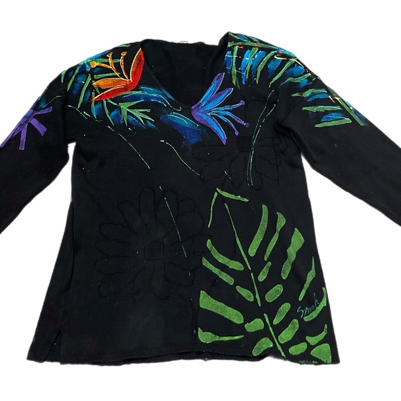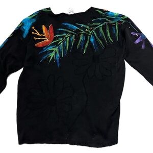 Vintage Sarah Hand Painted Originals Womens Sz XL Black Sweater Tropical Floral