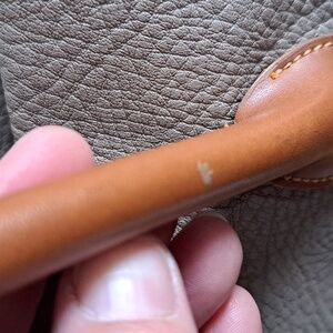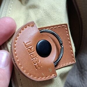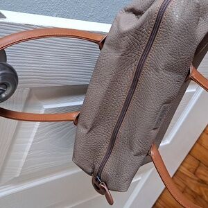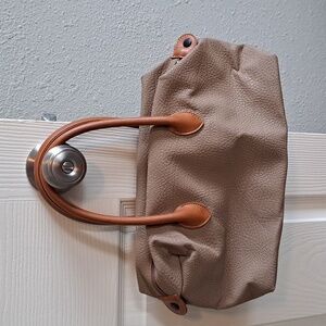 Gently used 1980s taupe handbag with brown handles.