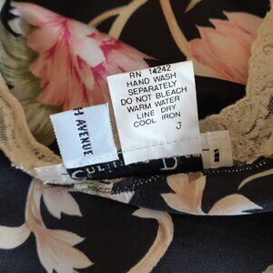 Originally from Saks 5th Ave, I believe this is probably vintage from the 1980's or so based on the tag and fabric print. 100% polyester but it's a very nice sateen weave, so it feels silky. Sleeves are about 3/4 length with a cute flower detail on the lace. Maxi length, total length from base of neck to bottom hem is approximately 54.5". Sleeve length from armpit to hem is about 14" (includes the 3" lace hem). One flaw is a small hole at the left armpit where it appears the fabric just sort of frayed at the seam (last 2 photos show it from the interior and exterior), I honestly never noticed it until I was taking measurements. Only getting rid of this because I have another vintage robe that I prefer more than this one and I feel like this is so beautiful that it deserves to be worn more.