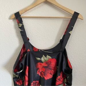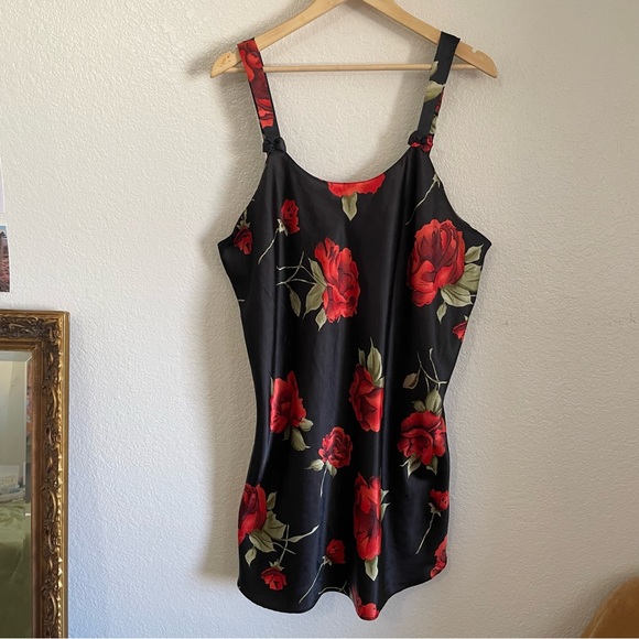 Vintage Satin Black & Red Stemmed Roses Floral Print Silky Slip Dress Just Love