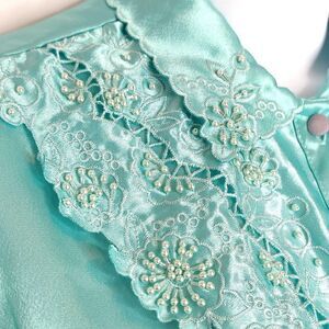Vintage Satin Blouse Puff Sleeve Sz M Green Embroidered Beaded Scallop Edge Coll