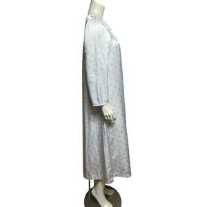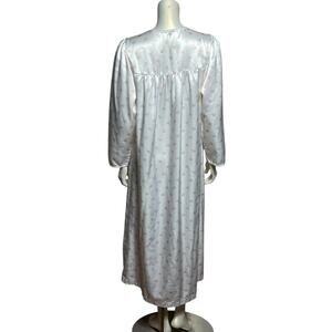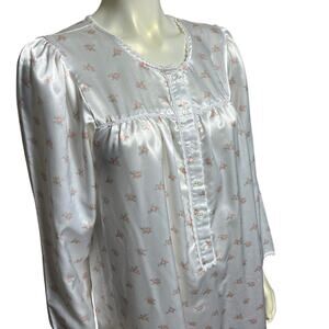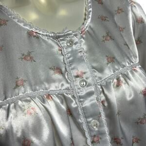 This beautiful vintage satin nightgown features a soft white fabric with a charming pink rose pattern. The gown is designed with long puffed sleeves, a button-up front, and delicate lace trim for a feminine and elegant touch. Its flowy, relaxed fit provides comfort, making it perfect for both sleepwear and lounging. The pastel floral design adds a romantic vintage touch to any wardrobe.