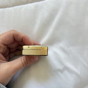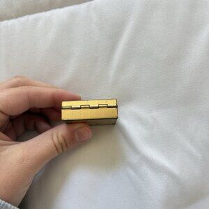 This vintage satin girl portrait pill trinket tooth box is a small, square shaped metal box with a gold finish and blue accents.