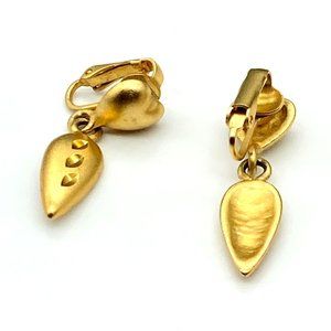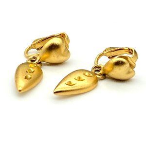 Vintage Satin Heart Earrings with Diamond Etched Dangle Drop, Classy Gold Tone Clip Ons