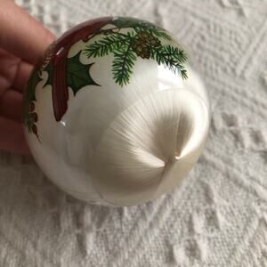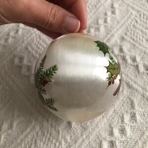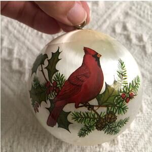 π Luminous satin-wrapped ball withclassic red cardinal perched in winter greenery decorated on plastic wrapping