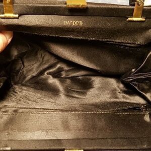 Beautiful 1950s black satin Ingber evening bag with a gorgeous rhinestone embellished clasp! It is clean inside and out. It measures 9" long, 6" high, and lies flat.