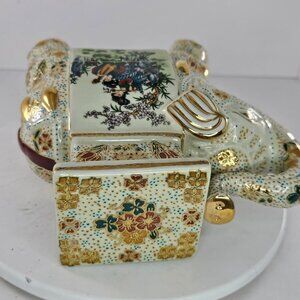 satsuma elephant, asian decor, vintage home accent, elephant figurine, gold accented decor, collectible satsuma, decorative stand, intricate design, home display piece, elegant elephant, oriental art, porcelain plant stand, hand-painted elephant