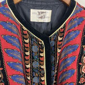 Beautiful collarless velvet tapestry jacket by Saxton Hall. Button front, lined. Note: buttons on both cuffs are missing, otherwise in excellent condition.