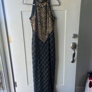 This exquisite black gown is covered in delicate gold hand beading and gold sequins. The beading is in pristine condition and the gown itself truly does represent the best of 1980's glamour.