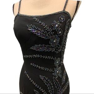 features: 100% silk Hand Beaded with iridecent beads in a floral pattern through out the length of the dress dress and along the straps. Slit in back for easy mobility.