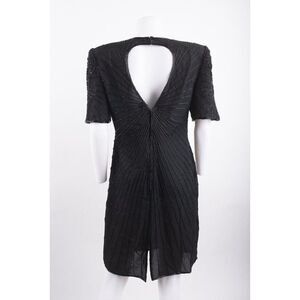 Vintage Scala Womans Evening Dress Size Petite L Black Beaded. 100% silk. fully lined. Shoulder pads. Zips in back. Low V-neckline. V open back. Slit at back hemline. Some beads are missing from Shoulder left back.Across Chest from underarm to