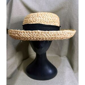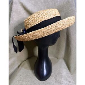 Vintage Scala Collection Woven Straw Hat Black Ribbon Trim Bow Feather Boho