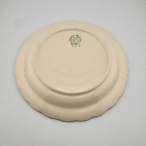 The Vintage Scalloped Saucer "Center Bouquet" in the Garland Shape by Taylor, Smith & Taylor is a charming saucer featuring a floral pattern in a retro brown color. Made of porcelain or bone china, this original piece has a glossy finish and is printed with the brand's backstamp. Produced in the United States, this vintage saucer is perfect for all occasions and adds a touch of elegance to any tea or coffee ceremony. The scalloped saucer and round shape make it a unique and stylish addition to any collection of decorative cookware and serveware.