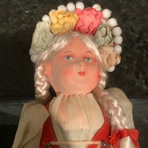 This is a beautiful vintage Scandinavian cloth folk doll, measuring 10.25 in. in size. The doll features traditional dress and blonde braided beribboned hair with a beautiful flowered head dress, blue eyes, and a light complexion. The doll is made of cloth and comes without packaging. Don't miss the opportunity to add this charming doll to your collection or give it as a gift to someone special.