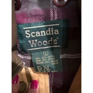 Vintage Scandia Woods chore jacket with leather collar and shoulders. Size large. Heavy and warm. Removable lining. Measures 27x26”. Great condition. One small spot on front pocket that I have shown in a picture. Looks like it may wash right out.