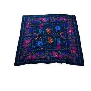 This vintage floral scarf is blue and fuchsia and measures approximately 31" x 31". It was made in Japan, likely in the 1960s. Scarf is in good condition with no issues noted.