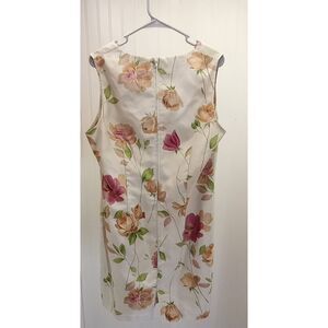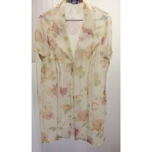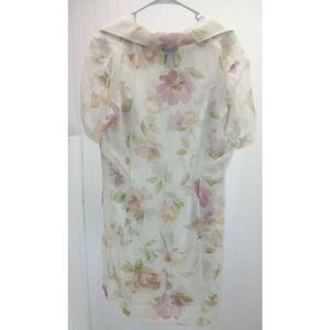 Pre-owned vintage two-piece dress set by scarlet. Beautiful tan silky material with floral design and sheer one button jacket. Dress is sleeveless with zip back entry. Dresses lined. Bodycon, fitted style.