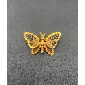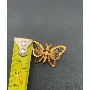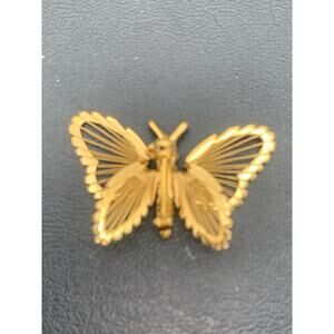 The vintage Monet butterfly brooch features a small gold tone design with wires, making it a unique scatter pin. Signed by the brand, this piece exudes beauty, nature, and charm. Made of yellow gold plated metal, this brooch adds a touch of elegance to any outfit, perfect for women who appreciate vintage jewelry with a whimsical theme. A statement piece that captures the essence of nature and femininity, this butterfly brooch is a timeless and charming addition to any jewelry collection.