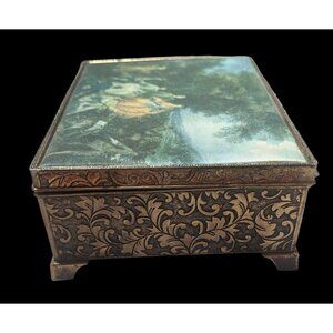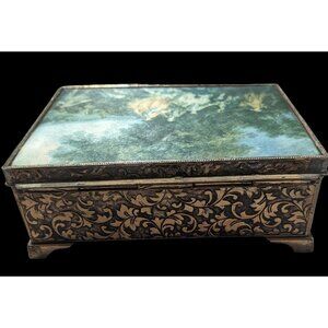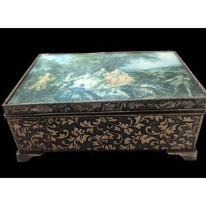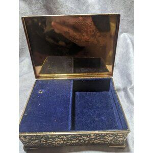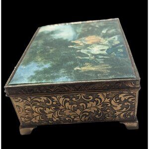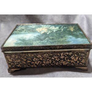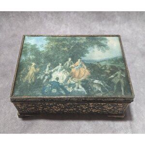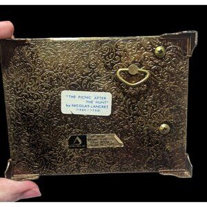 It's a heavy music box made from gold tone metal with an art nouveau floral leaf engraving all over. It has a fabric printed picture on the lid that says it's "The Picnic After The Hunt" by Nicolas Lancret (1690-1793). The bottom has a Schmid Bros sticker that says "Tune 201 Theme From Love Story Made in Japan". The inside is lined with a blue velvet-like fabric, and the underside of the lid is gold mirrored. As far as I can tell the music does not work. I don't know if it can be repaired or not. There are markings on the inner mirror, and some wear on the outside of the box. See photos.