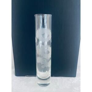 Vintage Schmid Etched Glass Sunflower Bud Vase w/ Weighted Bottom. It is a Cylindrical / tube-style vase measuring 7" tall. Made in china.