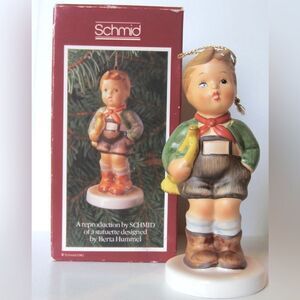 Vintage Schmid "Hark The Herald" Hummel Reproduction Ceramic Figurine 1983This vintage Schmid "Hark The Herald" Hummel Reproduction Ceramic Figurine from 1983 is a delightful piece for any collector. Produced in the first edition, this figurine is a charming reproduction of the classic Hummel style, known for its meticulous attention to detail and nostalgic appeal. The figurine depicts a young angelic figure, embodying the spirit of the classic Christmas carol, "Hark the Herald Angels Sing." With its vibrant colors and exquisite craftsmanship, this piece is not only a celebration of the festive season but also a valuable addition to any collection of vintage ceramics. A perfect heirloom, this figurine captures the essence of a timeless tradition and the artistry of Schmid's reproductions.