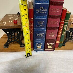 Elegant wooden bookends featuring decorative books in red, blue, and green. Perfect for adding a classic touch to any shelf.