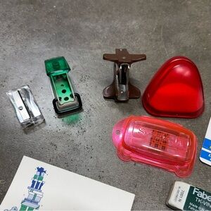 Large mixed lot of vintage and NOS school & office supplies from various eras. Includes Scripto mechanical pencil leads ( “Smooth Writing Long Leads” is empty) & erasers, Pentel Hi-Polymer eraser caps, Pentel Clic Eraser refills, Master & other pencil sharpeners, stapler remover, vintage erasers (Faber-Castell, Rub-A-Way, Magic Rub, Dixon, Math Renaissance, Eagle Turquoise), Sailor Leaf-It fingertip moistener, vintage stationery sheets, Silverette Gem paper clips (lid has been retaped), and more. Many items are new old stock (NOS) and sealed. Perfect for collectors, retro desk décor, or practical everyday use.