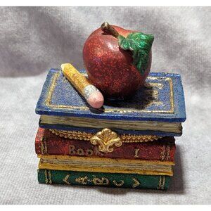 A charming Vintage School Teacher Book Stack Trinket Box, meticulously crafted to add a touch of nostalgia to your decor. Perfect for storing small treasures, this decorative piece is ideal for educators and vintage enthusiasts alike.