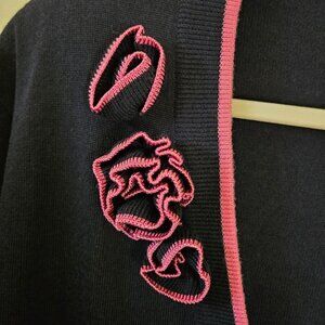 This vintage Schrader cardigan combines a unique 3D flower design with pink trim, offering a stylish and cozy lambswool blend. Features shoulder pads and pockets, perfect for adding a touch of retro flair to your wardrobe.