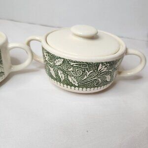 Charming vintage set ideal for serving sugar and cream. Features an elegant floral design in green and white. Durable and timeless.