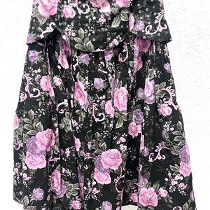 The dress is predominantly black with a vibrant floral pattern in shades of pink and purple, depicting roses and other foliage.