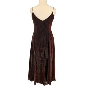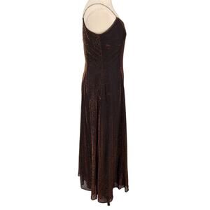 This vintage Scott McClintock formal gown radiates dramatic glamour and 90s elegance, crafted from acetate and mylar for a high-shine, iridescent shimmer. The rhinestone-embellished straps add sparkle, while the copper and black tones shift beautifully in the light. With a full-length silhouette and back zip closure, it’s a head-turning piece perfect for galas, evening events, or retro prom styling.