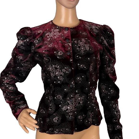 Make a statement with this vintage Scott McClintock women's burgundy velvet jacket. Featuring intricate beaded embroidery, this one-of-a-kind piece boasts a fitted silhouette and elegant puff sleeves. In beautiful vintage condition, it’s perfect for adding a touch of luxury to any outfit.