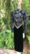 Wow. I can’t believe this dress still has tags on it. My guess is the 80s little puff sleeves with some large shoulder pads. Kind of a mutton chop feeling in a black velvet that’s been over embroidered with a metallic and purple and blue thread. The scallop dropwaist is trimmed in gold to a velvet skirt. There is a cut out back. And is back zipper. This is Deadstock new with tags and in excellent condition
