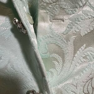 Features: mint green long sleeve button up to with skirt 2 pc suit with crystal rhinestone flower buttons. Queen Anne sweet heart neckline with crochet style guipure lace trim. Jacquard Damask print pattern all over. Tag of Jessica McClintock fragrance order form with fragrance sample still attached!