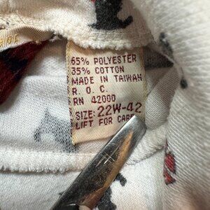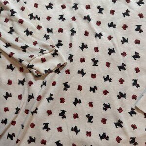 Jersey knit Polyester and cotton turtleneck. White background with red-nosed Scottish terriers wearing red bows with red bow pattern throughout. Cute for Christmas or winter. Made in Taiwan. Tagged 22W-42.