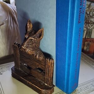 measures approximately 5 3/4" x 4 1/2" x Bookcase. sweet doggo jumping on the fence to peek over, even tho he has chewed through the fence as seen in this wooden bookend. Vintage Scottie Scottish Terrier Dog Orna Wood Bookend for the Dog Lover