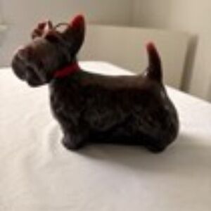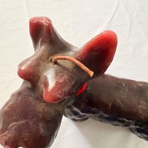 This vintage Scottish Terrier dog candle is a charming collectible piece, measuring 6 1/2" long and 6" tall. Made of wax, this candle is missing the tip of his right ear, but is otherwise in excellent conditionl. Perfect for dog lovers or collectors of Scottish Terrier memorabilia, this handmade candle is a delightful addition to any home decor or a thoughtful gift for a dog enthusiast.